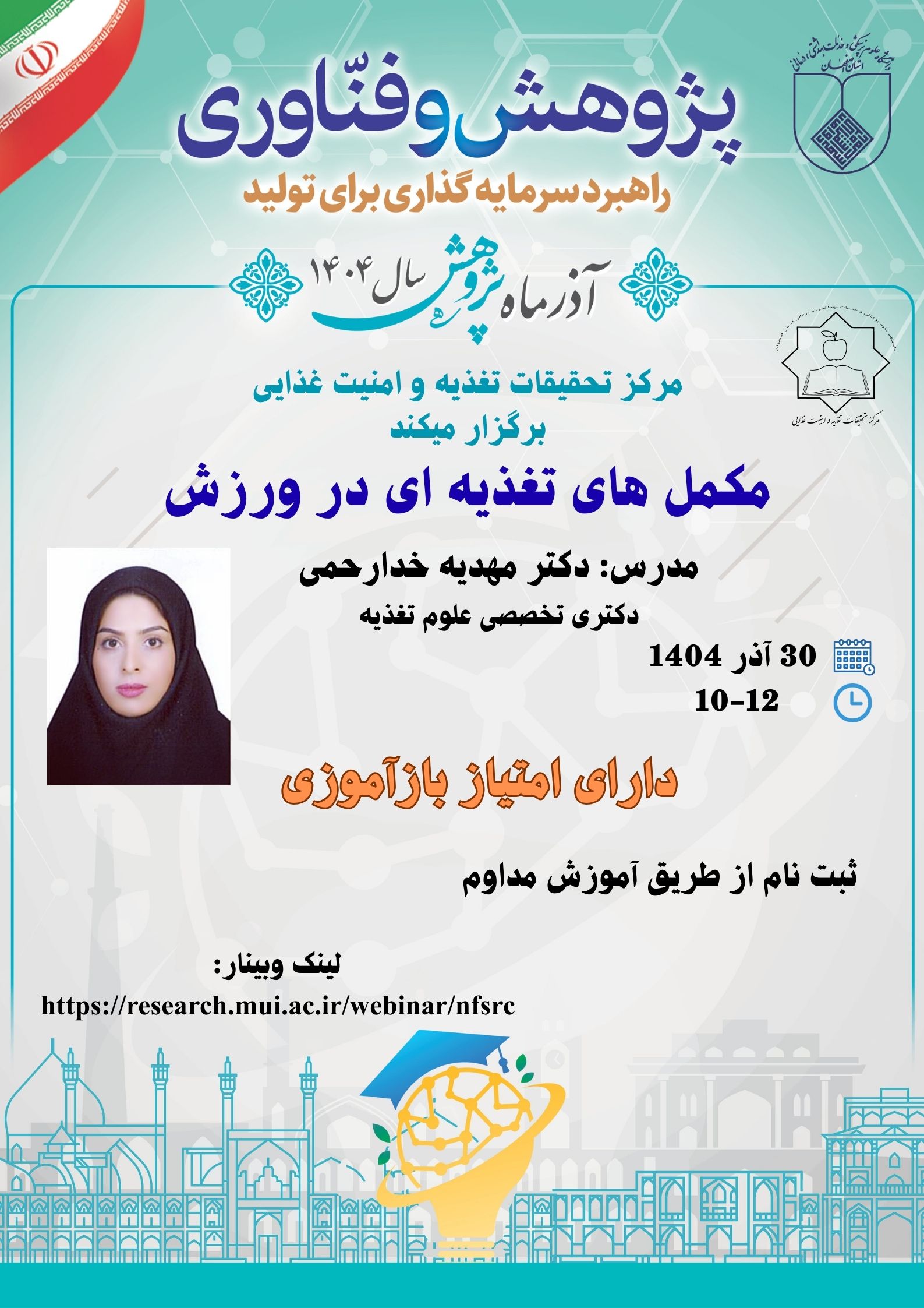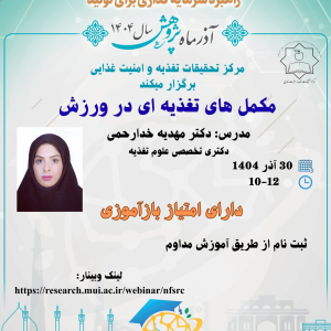 وبینار مکمل های تغذیه ای در ورزش مدرس: دکتر مهدیه خدارحمیزمان: 30 آذر 1404ساعت: 12-10لینک وبینار: https://research.mui.ac.ir/webinar/nfsrc